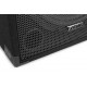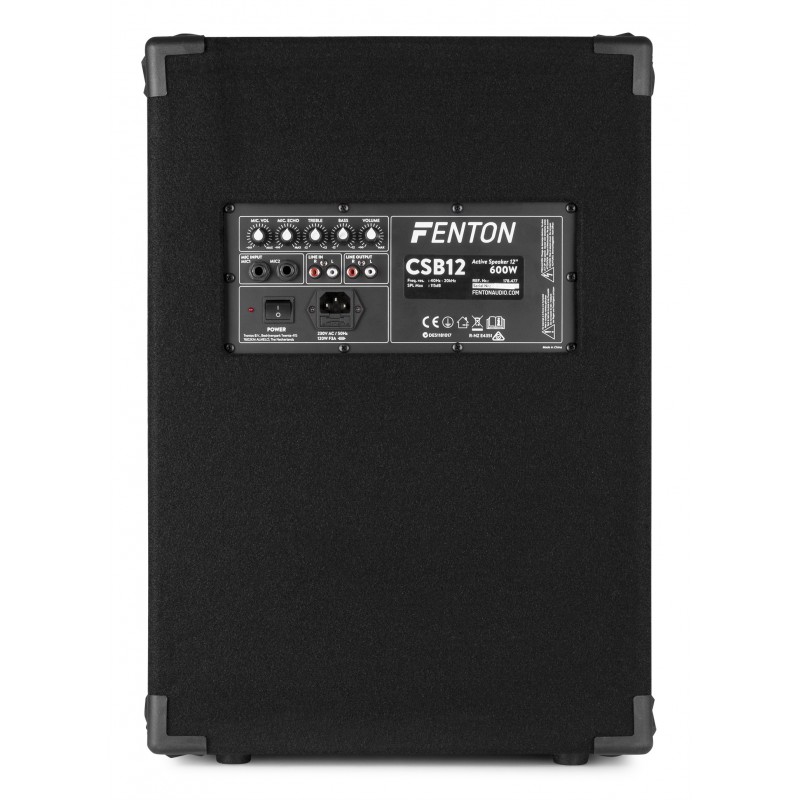 Bafle rectangular de 2 vías bass reflex que incorpora un amplificador de 600W, woofer de alto rendimiento de 12", trompeta piezo para agudos y medios, entrada para micro con efecto echo y entrada de línea para CD y MP3.