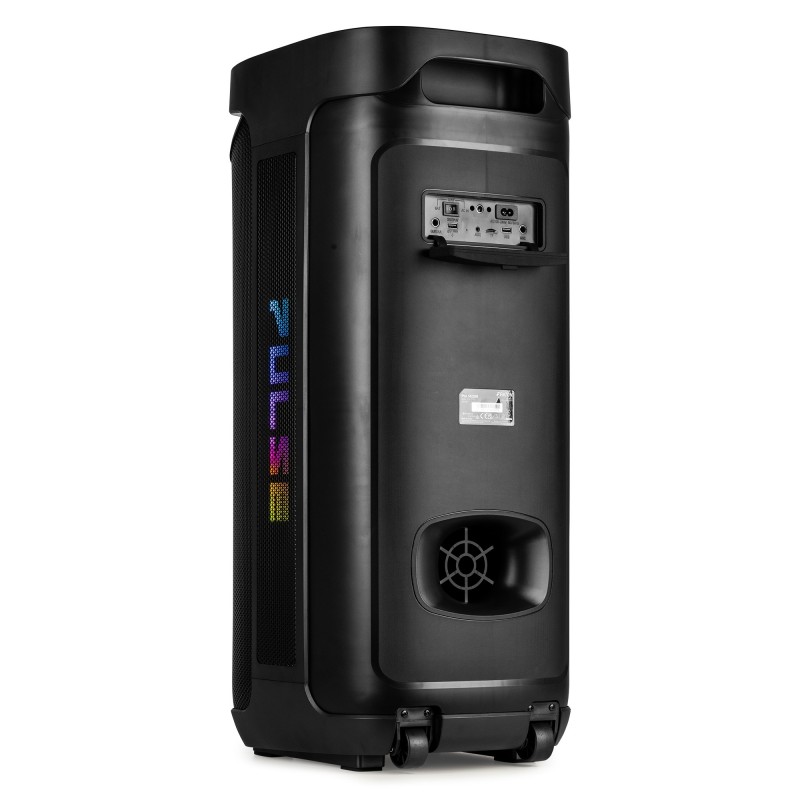 La serie Pulse Party Speaker presenta un espectáculo de luces sincronizadas en el frontal y en ambos lados. Gracias a la batería recargable incorporada, al micrófono inalámbrico y a numerosas opciones de entrada: tarjeta USB y micro SD, puedes cantar fácilmente todas tus canciones favoritas. Totalmente portátiles, también es posible conectar 2 altavoces Pulse de forma inalámbrica para crear un sonido estéreo más potente. La serie Pulse Party Speaker es resistente al agua IPX4.