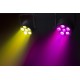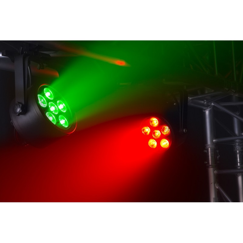 Este robusto foco Par con 6 LEDs x 8W 4-en1 (RGBW) ofrece alta eficiencia, refrigeración por convección natural gracias a la carcasa de aluminio con diseño especial para este propósito. No incorpora ventiladores por lo que este foco es totalmente silencioso. El menú LED con 4 botones permite acceso a la configuración DMX, máster/esclavo, activación por sonido y autónomo. La salida extra IEC y XLR 3 pin permite linkear varias unidades utilizando una sola toma de corriente.