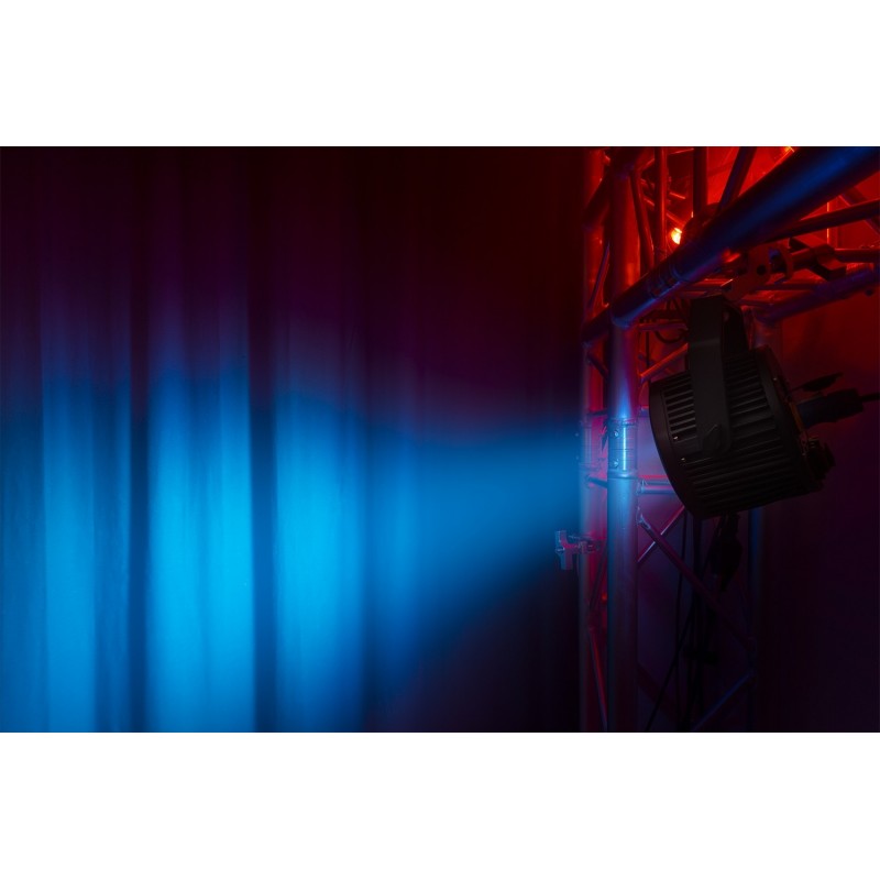 Con resistencia a intemperie de IP65 incorpora juntas estancas y conexiones aisladas de señal y alimentación. No utiliza ventilador, se refrigera por disipación por carcasa de aluminio. Incluye display OLED, DMX inalámbrico y doble agarradera para montar en cualquier lugar. Incluye mando a distancia inalámbrico.