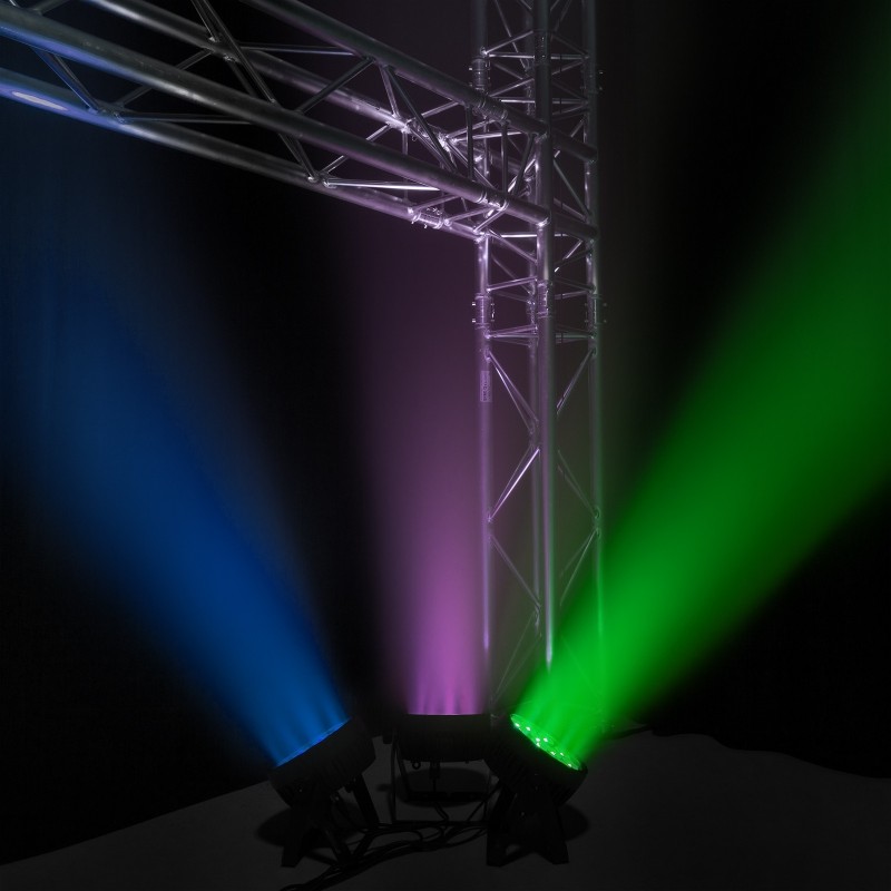 Este Par se controla por DMX o autónomo o al ritmo de la música. Cada color se puede controlar individualmente. Este foco no contiene ventiladores internos de refrigeración, lo que significa que el ruido de trabajo es cero. Efecto ideal para disco móvil, eventos en directo y cualquier aplicación móvil, además de poder montarse en aplicaciones fijas como boleras, disco, club, etc.
