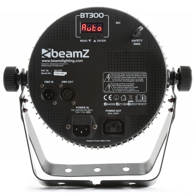Diseñado para no ocupar demasiado espacio tanto en el trust como cuando se transporta y con conectores de entrada y salida IEC para fácil link entre unidades. El BT300 incorpora programas en el modo Auto. En modo DMX puede elegir 4 canales con control de colores principales o 10 canales para control individual de cada color. También se puede controlar con el mando a distancia suministrado. La carcasa plana en ABS lo hace ideal para empresas de alquiler donde el peso y el espacio son muy importantes.