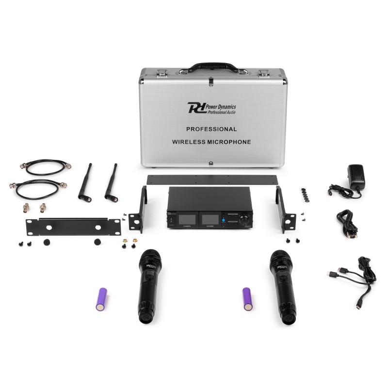 El receptor con pantallas LCD dinámicas y claras garantiza una transmisión sin interferencias, junto con el silenciador de alta calidad y el sintetizador PLL. El sistema de micrófono PD522 funciona en la banda de 500-530 MHz y es adecuado para voces, presentaciones, formación y otras aplicaciones de megafonía. Este conjunto viene con un receptor UHF de 2 canales, 2 micrófonos de mano con batería recargable de iones de litio, dos antenas BNC extraíbles, dos cables extensores para el montaje frontal de las antenas, un adaptador de corriente y un caja de aluminio. También se incluyen cables USB para cargar los micrófonos inalámbricos.